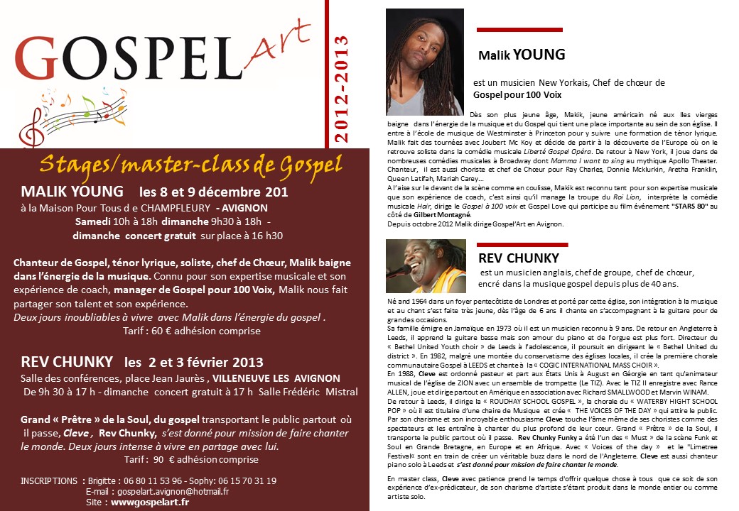 Chanteur de Gospel, Ténor lyrique, soliste, chef de choeur, Malik baigne dans l’énergie de la musique. Connu pour son expertise musicale et son expérience de coach, manager de Gospel pour 100 voix, Malik nous fait partager son talent et son expérience pendant deux journées inoubliable à vivre dans l’énergie du Gospel !