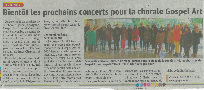 Un bel article dans le Dauphiné Libéré du 10/11/2021 qui présente la chorale de Gospel’Art, mentionne les dates des répétitions et celles de nos prochains concerts.